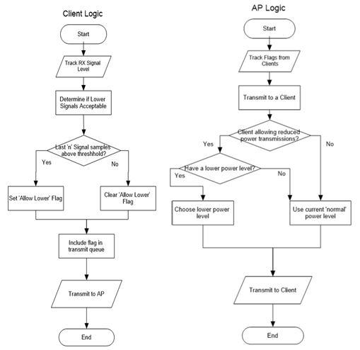 Note that the AP does not need to do any calculations and is dependent on a simple feedback flag from the client. The actual power reduction is predetermined. In our simulation, the reduction of 1 or 2 levels (3 dBm each) produced the best results.