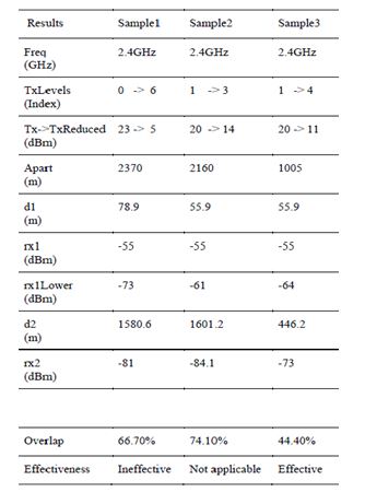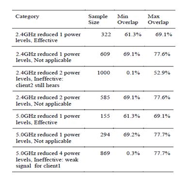 Based on thousands of iterations of the algorithm which determines the received power levels for both clients using FSPL formulas at various distances and power levels, we were able to classify the algorithm as effective or ineffective along with a reason and summary. The overlap statistic used in the results (distance between AP1 and client2 / distance between AP1 and AP2 ) removes the actual distance from the results and focuses on AP overlap; however, as expected, 2.4GHz distances were greater than the corresponding 5GHz distances. The detailed simulation results are given in Table 2.
