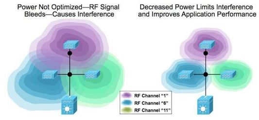 In combination with proper channel selection, transmit power needs to be adjusted to minimize the chance of interfering with nearby APs on the same channel but without creating a coverage hole [17]. Increasing or decreasing transmit power will increase or reduce the range of each access point. The needed to transmit power will depend on many conditions, including the distance between APs, end-device antennas, and numerous other factors [17]. Instead of always transmitting at the maximum allowable power levels, which will lead to huge amounts of CCI, there is a power level that will provide the necessary coverage without unnecessarily interfering with nearby APs [17]. This can be accomplished with extensive measurements and manual tuning or with more effective methods that use algorithms and the signal levels from neighboring APs to dynamically select the level [17] [18] [19]. Dynamic approaches allow scalability and support for large environments with hundreds or thousands of APs, like college campuses and corporate office buildings that would not be practical with manual power level tuning [18].