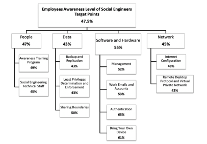 Using Figure 2, the authors calculated the employees’ awareness level regarding each social engineering defense mechanism. From figure 3, we see that, for example, only 49% of the employees attended training programs about social engineering, 50% of the employees aware of the data sharing boundaries in their organizations. Regarding the software and hardware, only 53% of the employees use their work email and account appropriately to avoid any potential social engineering attack, and finally, the figure shows that only 42% of the employees are aware of the right usage of the VPN and RDP protocols.