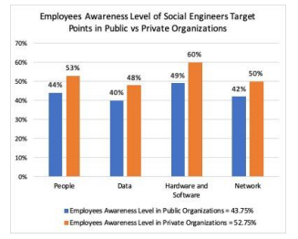 Overall, this study shows that only 47.5% of the employees in both public and private organizations are aware of the social engineering attacks and their defense mechanism
