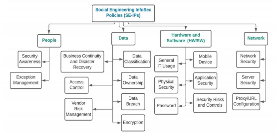 Additionally, recent security research [17] suggests that most organizations have unprotected data and poor social engineering cybersecurity policies in place, making them vulnerable to data loss. To successfully fight against social engineering attacks, organizations must develop and adopt Information Security Policies (ISPs). [18] defined an information security policy (ISP) of an organization as a set of rules and policies related to employee access and use of organizational information assets. Unfortunately, the research lacks well designed formal Social Engineering InfoSec Policies (SE-IPs) that organizations can adopt to protect their assets in the cyber-world.