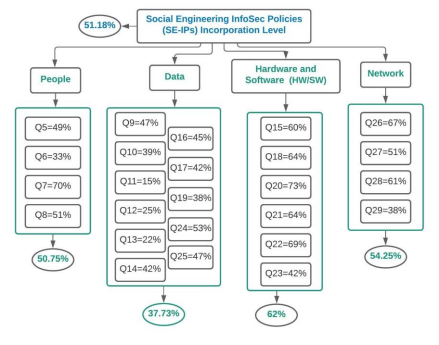 To answer the fourth research question, RQ4 (What is the current level of formal SE-IPs incorporation in organizations?), the authors analyzed the data obtained from the survey, to measure the current incorporation level of SE-IPs in organizations. To that end, the survey questions were grouped so that each group measures the incorporation level of a SE-IP. As a result, Figure 6 depicts the correlation between questions from the survey to the social engineering security policies in the SE-IPs taxonomy.