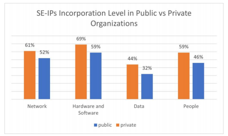 Employees in the private sector are more aware of social engineering attacks than employees in the public sector [11]. Moreover, this paper indicates that the incorporation level of SE-IPs in private organizations is more than in public organizations as shown in Figure 7 that compares SE-IPs incorporation level in public, depicted in blue bars, and private, depicted in orange bars, organizations. The figure indicates that 58.25% of SE-IPs are incorporated in private organizations, comparing to 47.25% of them in public organizations.