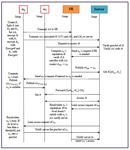 DistributeIndividualTrustSK(𝑃𝐾,𝑇𝐿,𝑠𝑘𝑢,𝑝𝑘𝑢′):It is carried out at the client system via verifying the admissibility of𝑢′. It verifies whether 𝑢′with public key 𝑝𝑘𝑢′is appropriate of the attribute TL i.e., it authenticates in which trust level 𝑢′is positioned. If 𝑢′is situated in the trust level 𝒱𝑇𝐿which is an integer and𝒱𝑇𝐿∈[0,𝑇𝐿𝑚𝑎𝑥]. Note that 𝑢′isappropriate for attribute𝑇𝐿𝑖,(𝑖≤𝒱𝑇𝐿). After, it results a secret TL key 𝑠𝑘(𝑇𝐿,𝑢,𝑢′)for client𝑢′.