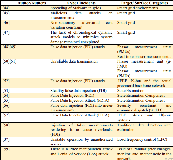 In table 3, the authors identified the following cyber incidents: false data injection (FDI) attacks, denial-of-service (DoS) attacks, distributed denial-of-service (DDoS) attacks, man-in-the-middle attacks, malware attacks, state estimation attacks, code injection, dynamic load altering attacks (D-LAA), unauthorized access to systems, eavesdropping, phishing attacks, and killing disk attacks.