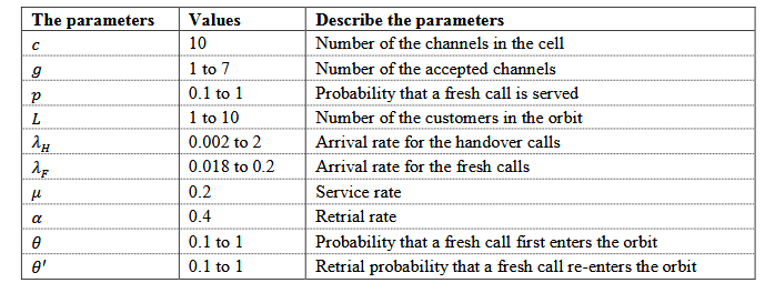 To generalize the above results, the research can be examined the retrial queueing model whose form is π/π/π/(π+πΏ) in combination with the fractional guard channel policies and the characteristic parameters, such as the probability that a fresh call first arrives and then it enters the orbit and the impatient customer probability that a call resumes to enter the servers. In contrast, it is unsuccessful and eternally departs and the additional features are the probability π (0<π β€1) that a call first enters the orbit when failing and the probability πβ² (0<πβ²β€1) which can be considered as a call next enters the orbit when failing, whereas [7] has only one fixed probability π for all calls entering the orbit. The main aim of our model is to lessen possibilities of being blocked with retrial and handover calls, significant factors to accomplish
