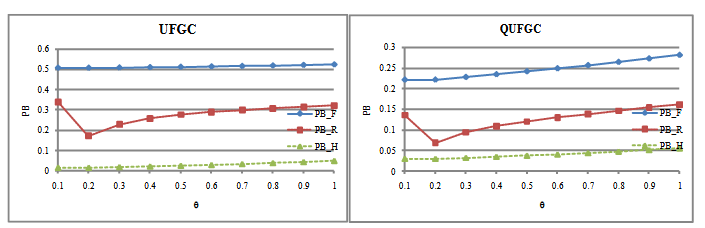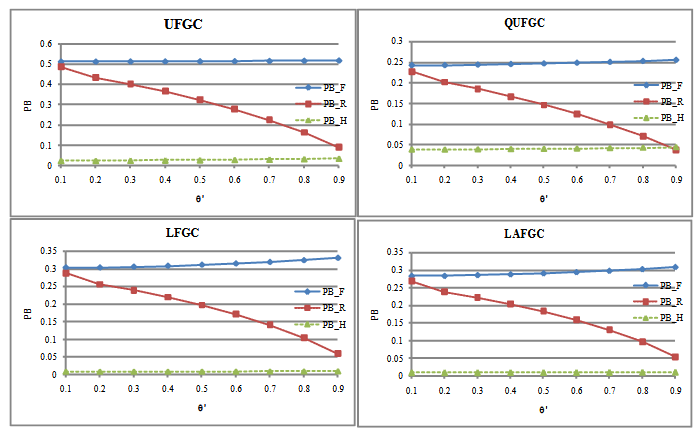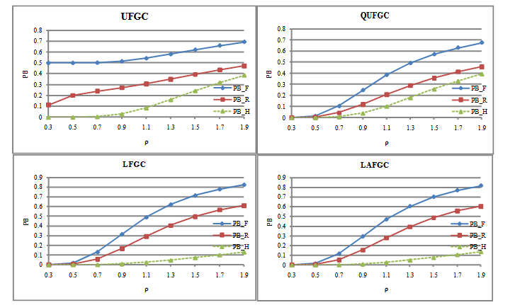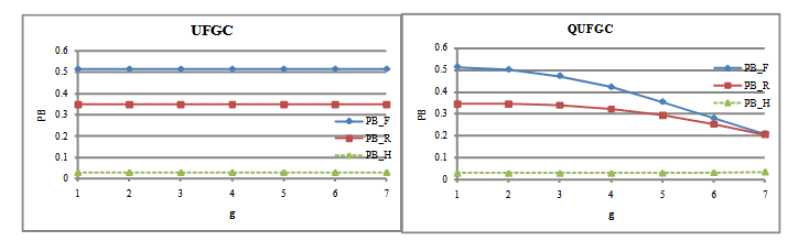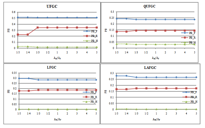 We find that the blocking probabilities ππ΅πΉ,πππ‘ππππ and ππ΅π» of LAFGC and LFGC are almost equivalent (Figure 10). Also, the blocking probabilities ππ΅π» of QUFGC and UFGC are approximately equal, yet the blocking probabilities ππ΅πΉ,π of QUFGC are better than those of UFGC. This is explained that the accepted probabilities π½π of QUFGC are 1 at some initial states.