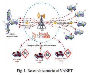 several applications which are mainly categorized into two categories like, safety and non-safety applications. The safety applications perform transmitting safety messages and warning messages for assisting the road to prevent accidents. These messages can include various types of information such as road accidents, traffic jams, emergency vehicles, and road construction, etc. Figure 1 shows actual research scenario of VANET and how emergency messages are unsafe in data transmission process.