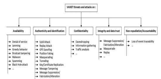 Data reliability, confidentiality and user anonymity provides enhanced security to the network.Due to the aforementioned reasons, VANET security is widely studied. These attacks include availability attacks such as denial of service (DoS) and black hole attach, authenticity attacks such as Sybil attack and GPS attack, data confidentiality such as eavesdropping and data trust, non-repudiation such as loss of event traceability. Figure 2 shows a classification of various attacks on VANET.