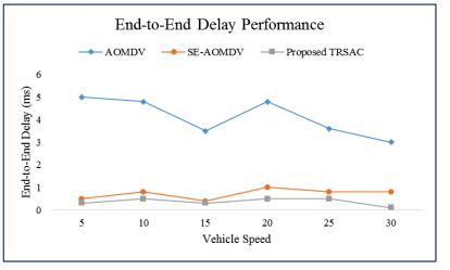 According to this experiment the average Network Throughput Performance is obtained as 1.27%, 1.38% and 1.62% using AOMDV, SE-AOMDV and proposed approach, c. End-to-End delay: later, experimental analysis has been done for end-to-end delay computation. The proposed approach uses light weight computations and less computational cost helps to achieve the less delay. The obtained performance is