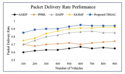 Figure 11 shows a comparative performance where the packet delivery performance is obtained as 0.64, 0.71, 0.81, 0.86, and 0.91 using AMDF [32], PPRR [33], DAPP [31],SASMF [34] and Proposed approaches.