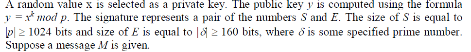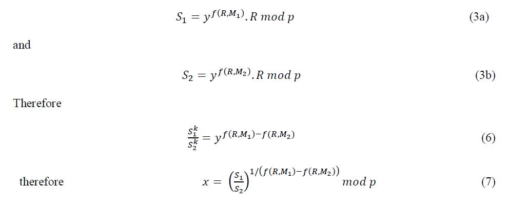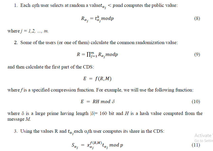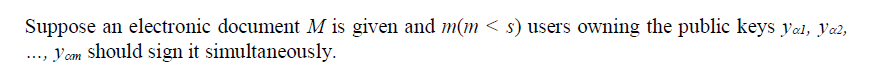 Let m group members (having public keys 𝑦𝑖 = 𝑥𝑖𝑘 𝑚𝑜𝑑 𝑝and corresponding private keys xi , i = 1, 2, …, m) wish to sign the document M.