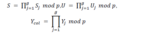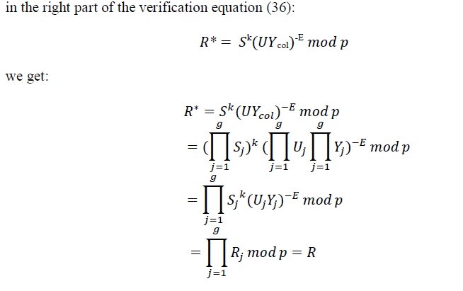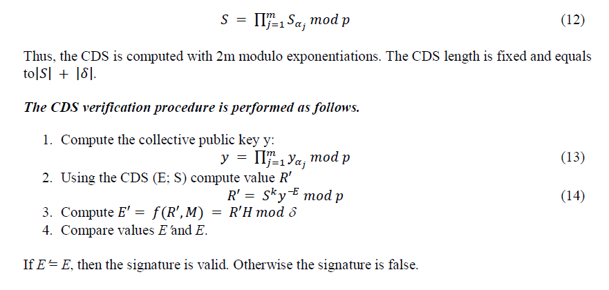 In the proposed collective DS scheme the signature verification procedure includes the steps of the verification procedure in the group signature scheme and an additional initial step for computing the collective public key (step 1). In the signature verification equation it is used the collective public key Ycol instead of the group public key.