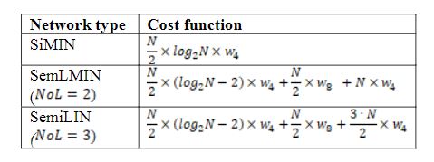 On the basis of complexity, the functions of cost can be computed, considering the individual cost units of every SE, mentioned as weighting items. The functions of cost for some typical omega-type MINs are reported in Table 2.