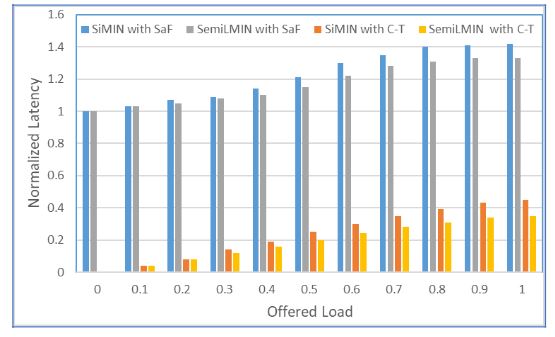 A similar improvement is observed in comparing the SiMIN and SeLMIN fabrics. Furthermore, when the arrived load is lower than ~40%, the type of forwarding technique and architecture do not matter. From the same graph, the normalized throughput’s values divergence owed to architecture, and for the C-T method, this starts when the arrived load is approximately ~40% as shown by the first two bars in the corresponding bundle. On the other side the divergence of the throughput values owed to architecture for the SaF case starts a little bit earlier at an offered load of 40% as can be observed in the third and fourth bars.