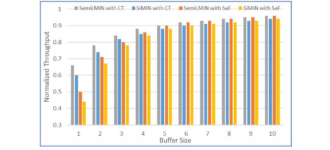 For the corresponding single-layer MIN operating via the SaF forwarding method, the normalised throughput is 13%. The first bar in orange represents the results for a SiMIN with the SaF method. The second and the third bars in grey and yellow respectively, represent results for SiLMINs that use the C-T forwarding method and they differ in buffer size. The fourth and fifth bars in light and dark blue respectively, depict results of SemiLMIN that operates via C-T mechanism but differ in buffer size. Table 1 shows the values of the normalized throughput for SemiLMINs and SiMINs using the C-T and SaF mechanisms, respectively.