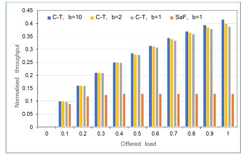 Fig. 9 shows the normalized throughput for a single-layer omega-type network with size equal to six, meaning that the MIN block has 64 inputs and 64 outputs ‘working’ with the C-T or SaF techniques with different buffer sizes, for arrived traffic load which has a hotspot ratio (h) of 10%. The three first bars, depicted as grey, yellow, and blue respectively, show devices ‘working’ with the C-T method, and it can be infered that a relatively minor amelioration in the throughput metric is achieved when the buffer size increases. For example, if a maximum offered load with a hotspot traffic ratio equal to ~10%, the normalised throughput is 39% if the system has a buffer size of one. For the same traffic conditions but with a buffer size of 10, the normalised throughput is 41.6% indicating a gain of just 2.6%.