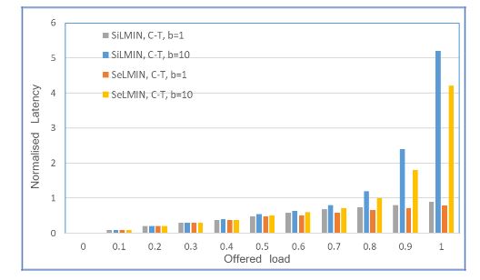 Also, the same SiLMIN consisting of buffer-size equal to 1 that operates via C-T mechanism presents approx. 4 times less packet latency compared with an equivalent SiMIN equipped with buffer size equal to 10 for full offered load. That is confirmed by estimating the difference in values of the last two bars in Fig. 11, i.e., 5.2-0.79=4,41.