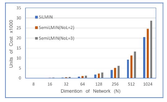 The complexity of a MIN depends on the number of SEs involved. An N x N SiMIN consists of N / 2 (log2N) SEs. Furthermore, an N x N SeLMIN with a double -layer fan-out (NoL =2) in the latter stage is made up of N / 2 . ((log2N) – 1) + N SEs in each single-layer segment, and a number of 2. N / 2 = N SEs in the fan-out module.