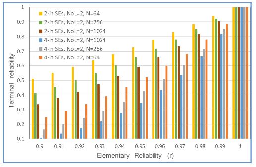Figure 13: Overall terminal-reliability of semi-layer omega-MINs with NoL = 2 and different network dimensions, constructed with two-input and four-input SEs, versus the simple reliability of a typical SEs.