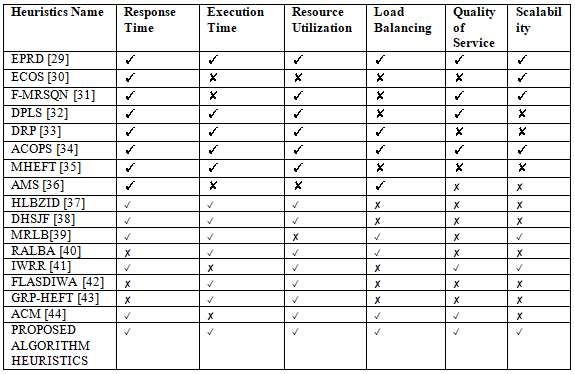 The shared infrastructures handle tens of thousands of applications under a broad application of cloud computing environment. Thus, in such a diverse application environment, shared resource allocation to meet QoS requirements has become a real challenge due to the properties and application workload differ widely and may change over time. These issues are handled through Round Robin, static allocation schemes, and even load distribution, probabilistic allocation policy [24]. In dynamic tasks, batches-based workflow applications use DAG-based algorithms, implementation for renting virtual machines, resources in cloud computing. These tasks under different task-batches merged into a unit of the task, and this unit aware deadline allocation policy executes workload and task deadlines to minimize rented interval utilization. This kind of rented VMs allocation saves rented costs in DAG-based platforms [25]. The hypervisor improves the efficiency of a single physical server by converting it into multiple virtual servers with the help of virtualization technology [26]. Service Level Agreement (SLAs) violations are very important issues and may happen while doing virtual machine instances, resource allocation from the overloaded host. To protect from SLA violations, we have to do the allocation of VMs from underloaded host machines, which turn in idle host conditions during under load conditions. We can save energy consumption to start new resources for the workload request allocation purpose [27, 28]. Some comparing factors of existing and proposed algorithm heuristics are considered for comparison and represented by Table 1, including the following parameters: Response Time, Execution Time, Resource Utilization, Load Balancing, QoS, Scalability, and Energy Consumption.