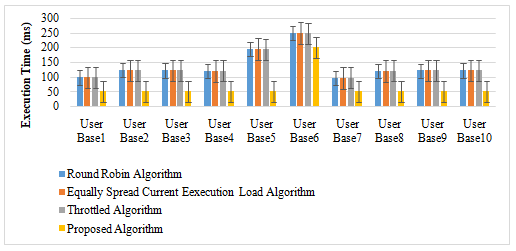 The following figures represent the result computed through existing and proposed scheduling heuristic algorithms simulation. One by one, both the policies are executed using the above-shown configuration. Based on that all the result generated from First and Second Test Bed executing the user request with an average response time has been represented in Figure 3, Figure 4, Figure 5 and Figure 6 respectively. We have tested our results with three existing CloudAnalyst simulator algorithms, i.e., Round Robin, Equally Spread Current Execution Load, and Throttled. Figure 3 represents request execution average time for peak workload situations, and it is clearly shown through the result that our proposed scheduling heuristic algorithm gives improved request execution average time.