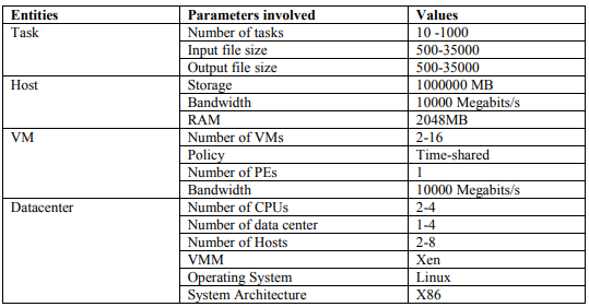 The CloudSim Toolkit (Simulation platform) is used [37] to evaluate the performance of the proposed strategy. This software simulates a real-time cloud computing environment. Users can directly conduct performance testing of different scheduling algorithms in CloudSim. The infrastructure of cloud systems can be simulated using the datacenter entity in CloudSim, and the data center comprises one or more hosts. Each of these hosts may be assigned several VMs. The user tasks are assigned to these VMs. All of these entities are characterized by some parameters. Table 1 lists the parameters and values used in this simulation environment.