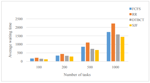 Fig4 illustrates the average waiting time obtained for two virtual machines. The waiting time is optimal for the Shortest Job First algorithm. But when compared with RR and FCFS, the average waiting time is less for DTBCT and tending towards the optimum value. The algorithms have been executing with the number of tasks 100, 200, 500, and 1000. When comparing the performance, DTBCT is 10% efficient than RR.