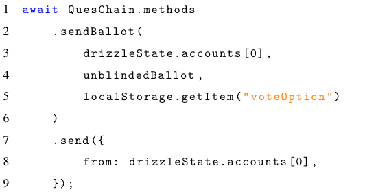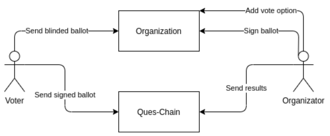 The project consists of two separate applications dedicated to two groups of users. The first is a Voter which is a person taking part in voting. The second is the voting organizer whichis a person responsible for creating and conducting a vote. The application for voters will be available at the selected internet address. Any user can use the application and vote. Only verified users’ ballots will be counted towards the voting results. The application for the voting organizer may be run locally and may not be available from any internet address. Two smart contracts were created for voting. First is organization contract – used to create voting and verify user ballots, second is Ques-Chain contract – collects verified users ballots and allows you to check the voting result. The voting organizer can create a new vote by adding voting options to the organization contract. Then the voter sends his ballot for verification. Also, the verification and return of the signed ballot take place under the same contract. Only sending the verified ballot is done through the Ques-Chain contract. The organizer has access to them and can count the ballots and share the voting result.
