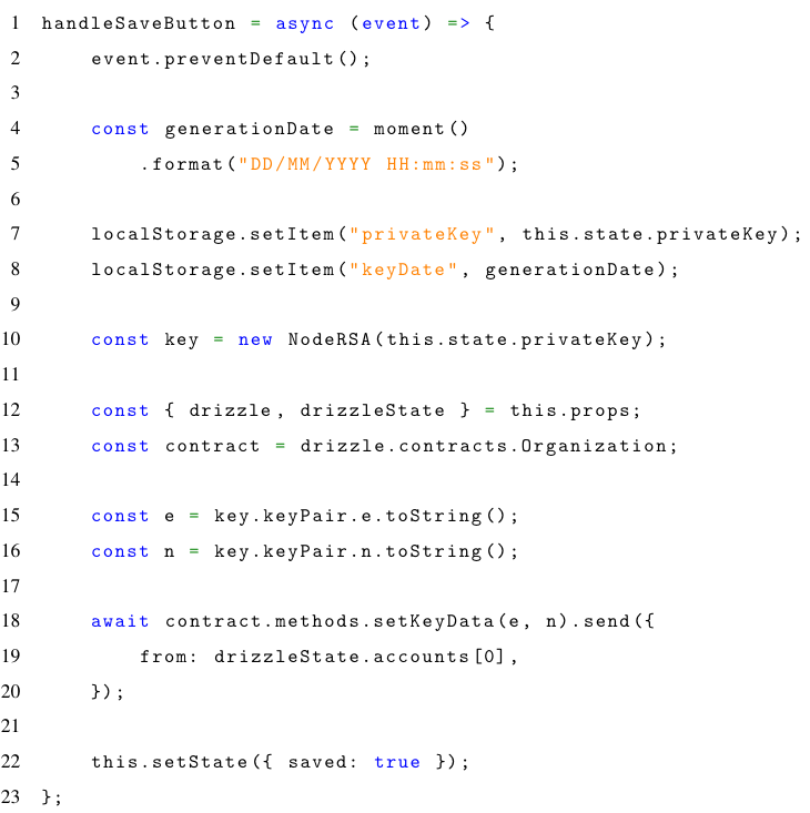 The contract has one voting structure. It contains a unique identifier, user address, unblinded ballot, and the selected option. User ballots are stored in the mapping structure. The user sends a ballot by specifying three parameters: user’s address, unblinded signature, and the selected option in voting. The voting results are serialized to a string variable. The share result function takes only one argument. The “Private” key page is used to generate the RSA key. The key can be generated using the PEM string. Above the field for entering the private key, the date of generating the current key is displayed. The data is generated and formatted using the moment library. The date and private key are saved in local memory. An RSA key is then generated using the key entered. The two components of the RSA key (e and n) will be used to encrypt the ballots. Therefore, they are included in the Organization contract.