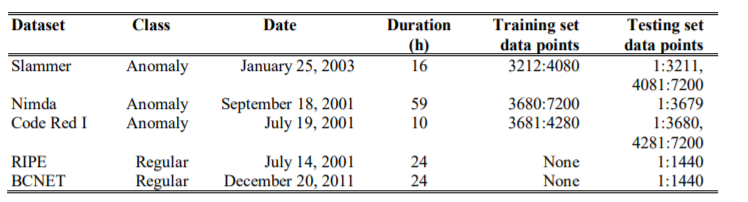 BGP raw data are collected from AS513 (RIPE RIS, rcc04, CIXP, Geneva) during worm attacks like Slammer [29], Nimda [30], and Code Red I [31]. for the same duration, we downloaded the standard BGP datasets from RIPE NCC [32] and the BCNET Network Operations Center [33] from Vancouver, Canada. To convert MRT [34] to ASCII format, the libBGPdump tool [35] is used. Based on the tools written in C #, we parse the ASCII file and extract 37 features sampled in five days each minute, generating 7,200 samples for each anomaly case.