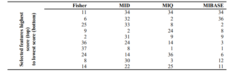 To select the top ten features, we use three variants of the mRMR algorithm: Mutual Information Difference (MID), Mutual Information Quotient (MIQ), and Mutual Information Base (MIBASE). These selected features according to the feature selection algorithm are presented in Table 2.