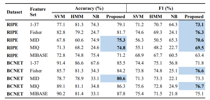 Table 4 shows the performance comparison of previous methods (SVM (Support Vector Machine), HMM (Hidden Markov Model) and, NB (NaΓ―ve Bayes)) with the proposed method. For the RIPE dataset when compared to previous methods, the proposed approach delivers better accuracy for MID and MIQ-based features. For MID-based features, it provides 75.3% accuracy which is 0.4% higher than the 74.9 the previous best provided by HMM. For MIQ-based features, we get 74.8% which is 3.5% higher than the previous best 71.3% provided by SVM. When comparing in terms of F1 score the proposed classifier works better for all features set except for the MIBASE. Since the F1 score presents the combined information of Precision and Recall the higher value of it even when the Accuracy measure is lesser shows the better classifier performance.