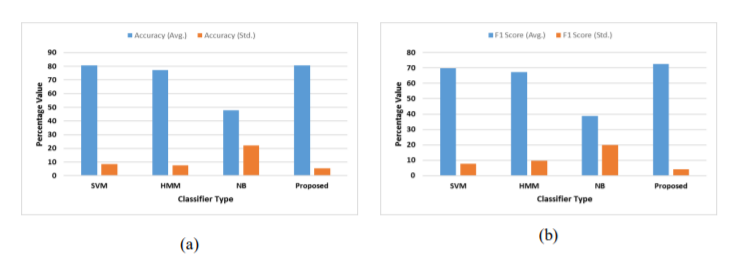 The proposed algorithm gives an average 80.65% accuracy for all datasets with a standard deviation of 5.52%, whereas SVM provides 80.69% accuracy however with an 8.42% standard deviation. When analyzed for the F1 scores the proposed method gives a higher average F1 score of 72.64% with only 4.11% of standard deviation in comparison to the second-best SVM which provides 69.66% average accuracy with a 7.66% standard deviation. This validates that the proposed method gives much uniform performance for all the five features set in terms of accuracy and F1 score.