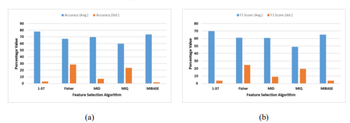 Figure 5. Mean and standard deviation in (a) Accuracy, and (b) F1 Score, of different feature selection techniques for only the BCNET dataset