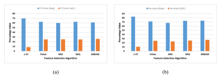 Figure 4. Mean and standard deviation in (a) Accuracy, and (b) F1 Score, of different feature selection techniques for only the RIPE dataset