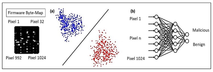 Figure 3. Illustration of steps to map firmware to abstract images (a), then solve the classification problem in image space (b) using both statistical machine learning and deep neural network classifiers