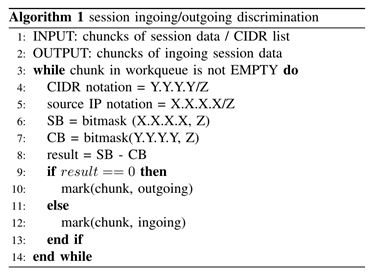 Traffic discrimination is to identify traffic data into ingoing/outgoing. Traffic discrimination is essential to preprocess to analyze data in Splunk for time-series analysis to extract traffic patterns. Also, after diving session data into egress/ingress, we can proceed to the procedure of map-reduce to generate a histogram of traffic data. Algorithm 1 depicts the procedure step for traffic identification of ingoing/outgoing. At the first phase of this algorithm, session data have been divided into tens of chunks. The final goal of this algorithm is to mark ingoing/outgoing labels for each column of data. At lines 6 and 7, a bit sequence of source IP address session data (noted as SB) is obtained. Also, SINET address range (noted as CB) is provided for bitmasking. Then we proceed to line 9. If SD is equal to CB, the direction of the column is identified as outgoing. In the algorithm, instead of matching SD to CB directly, minus operator is used at line 8. Finally, if the result is 0, we add the flag of $outgoing$ at the head of the column. If the result equals 1, ingoing label is added to the column.