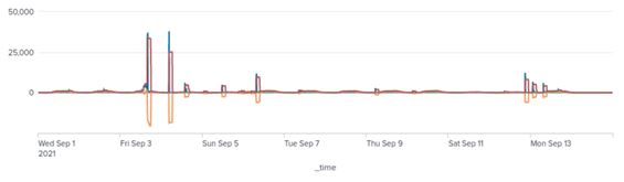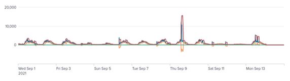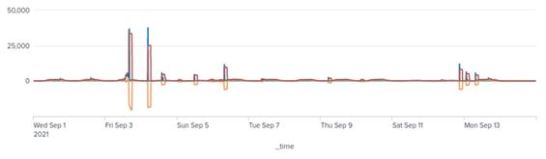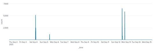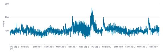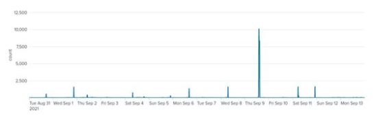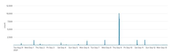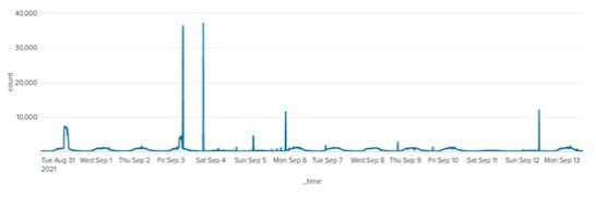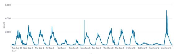 Figure 8. Time series of egress traffic of port 443. A cyclical pattern can be seen between weekdays and weekends. Perhaps some of the IoCs are generating normal traffic, for example, they may be providing some kind of web service. In addition, sessions of around 4,000 were observed on September 6 and 13, but this requires further investigation