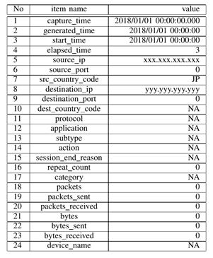 Our analysis is based on the passive measurement by PaloAlto 7080. The thrust of the PA-7000 series is a scalable architecture for the purpose of adopting the flexible and powerful processing of the tasks of firewall and security management. A firewall such as PaloAlto-7080 plays an essential role in network security. Traffic patterns of session data are extracted from the session data of PA-7080. Table 3 depicts the session data format. Column 1-9 is about TCP/IP packet header related items. Column 19-23 is used to generate statistics. Column 12 (application) and column (category) are essential for characterizing the traffic patterns.