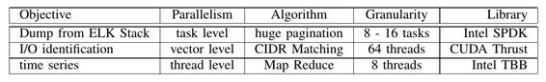 Table 4 shows parallel computing technologies adopted in three phases in our pipeline. First, retrieving data from ELK stack is leveraged by huge pagination in task level. Second, inside multi-GPU server, vector level parallelism is adopted for CIDR matching. Finally, Intel TBB is used for generating time series data by map-reduce algorithm in thread level. Ando et al. [18] discuss the effectiveness of the appropriate choice of parallelism in building the dataflow pipeline for handling huge traffic flow.