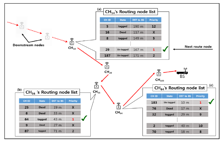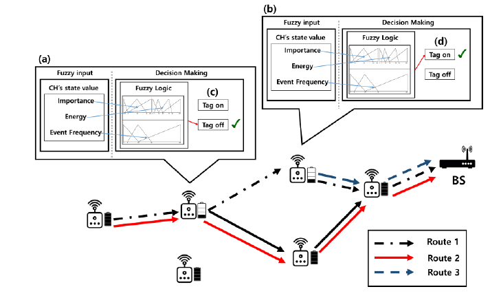 Fig. 6 shows a resetting of the routing in the proposed scheme. Each CH checks whether its energy reaches a predetermined energy threshold during each cycle. A node that reaches the threshold value initiates the fuzzy logic system, which inputs its geographical importance, available energy, and event occurrence frequency, and checks whether the node is at risk of energy exhaustion. Nodes that are determined to be at risk of exhaustion are tagged. A tagged node breaks all routing to itself for the remaining lifetime of the battery and performs only event detection and report generation, as shown in Route 3 of Fig. 6. Each CH also has a routing list, as shown in Fig. 7. Nodes with depleted energy are dropped from the list, whereas the tagged nodes remain on the list but are excluded from routing priority. As shown in Fig 7-(b), if all nodes in the Routing node list are tagged, the next forwarding node is selected according to DST to BS (Destination to Base Station). By managing the routing list in this way, nodes can avoid the confusion that can occur in energy-starved or tagged situations and prevent routing bottlenecks, which can cause the number of hops to the BS to increase.