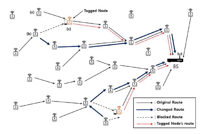 Fig. 7 shows the routing of a proposed scheme for the WSN field using CHs using cluster-based security protocols [4], [6], [8], [9], [35], [36]. Node (c) in Fig. 8 is tagged and blocks all incoming routes to itself. It performs only event detection and report generation until the battery runs out. In the case of node (a) in Fig. 8, the routing to node (c) is blocked and the routing is re-selected based on its routing node list. However, the routing to node (c) in Fig. 8 is forcibly rerouted because it has no other options. In the case of node (b) in Fig. 8, the routing to node (c) in Fig. 8 is cut off, and the routing is changed by selecting the next priority node in the routing list.