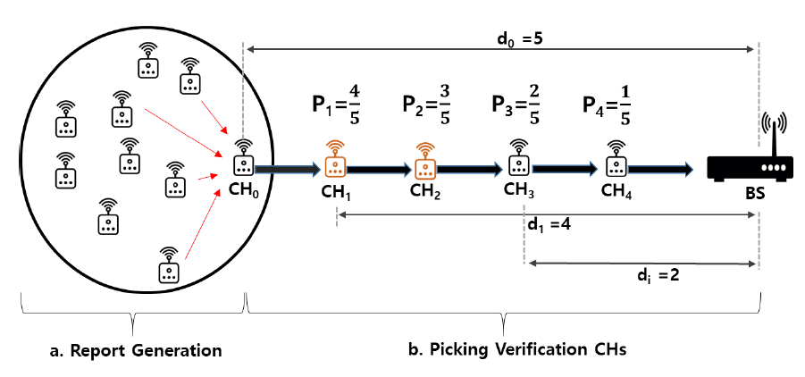 (2) Selection step of the verification node: An intermediate CH to be a verification node probabilistically selects a verification node based on the distance configured by routing based on the shortest path algorithm. The CH node selected as the verification node receives one of the keys of member nodes randomly after exchanging the session key with the member nodes of the event detection cluster.