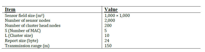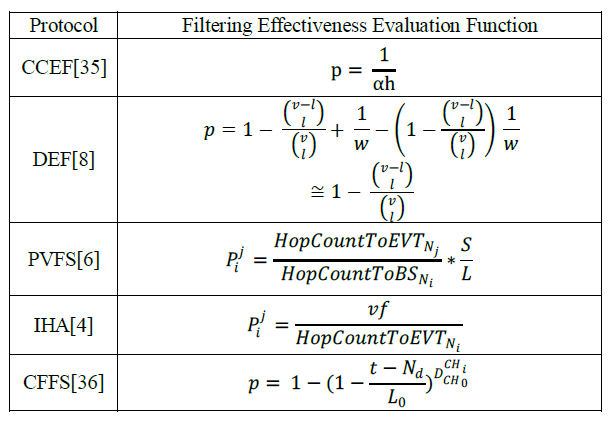 where Pij is the probability that the i-th CH becomes a verification node of the j-th node, and ecal denotes the calculated cost. The probability Pij differs from protocol to protocol. The Pij for each protocol filtering effectiveness for representative cluster-based protocols as the below Table 1.