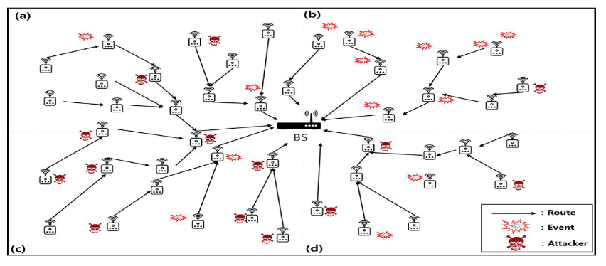As shown in Fig. 1, the attacker exploits this weakness to compromise nodes using various kinds of attacks. These attacks cause unnecessary processing in the node, shortening the lifespan of the node and interfering with the transmission control. Several protocols have been proposed to increase network security and lifetime by defending against such attacks [4-9], [35-38]. Most of these methods involve cluster-based routing. Cluster-based routing benefits from the local management of nodes and makes systemic report generation possible. However, there are some disadvantages. A routing path consisting only of a Cluster Head (CH) node can be easily burdened with energy consumption loads to a certain CH when that CH is no longer usable due to battery discharge. In particular, in a protocol in which a CH is not re-elected, if the corresponding node is out of service, the region detected by that CH becomes a shadow region and further detection and report generation become impossible [10].