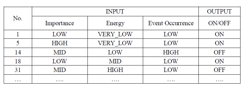 The proposed system uses three membership functions: importance, energy, and event occurrence. The fuzzy inference engine also has two outputs: tags on and tags off (holding tagging). Based on the number of membership functions, there are 36 total rules; some of the rules are shown in Table 2. The optimization of the membership functions based on the rules was implemented using a genetic algorithm (GA) [22-24]. Optimization algorithms using GAs have been studied extensively [25-27]. A GA is a global optimization technique developed by John Holland in 1975 as a computational model based on the evolutionary process of the natural world. Models involve a representative technique of evolutionary computation that mimics the evolution of living things. Such techniques represent a normal course of evolution, including mutations and mating operations [28].