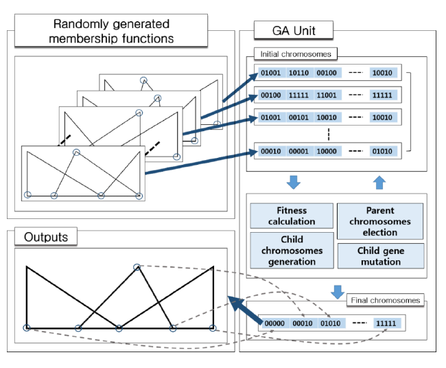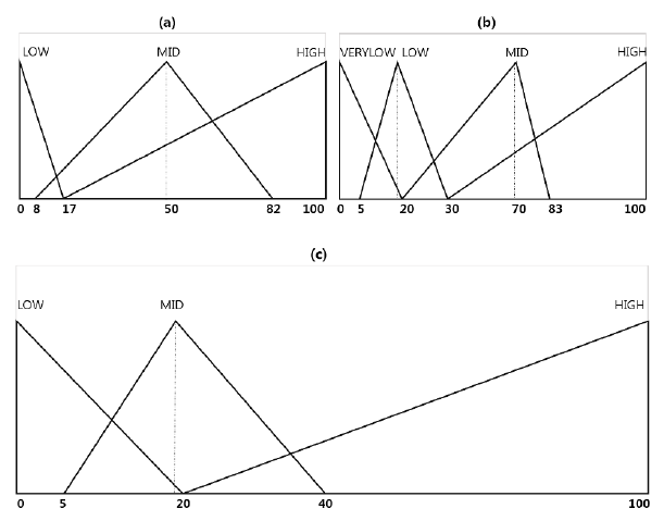 In the proposed scheme, 20 membership functions were randomly generated, and each point value was converted into genetic information for the chromosome used in the GA unit. In the GA unit, the fitness of each chromosome is evaluated based on the error rate between the output values of the chromosomes and the output values set based on the rules of the fuzzy system. In the GA unit, the chromosomes are ranked in order of best fit, and the parent chromosomes are randomly selected based on the ranking. In the proposed method, the diversity of the chromosomes was increased by applying a mutation technique, with a mutation rate of 0.3% [29-30]. Only results with a zero-error rate were used, and the desired result can be obtained in less than one minute within approximately 50 generations on a desktop computer base station with a single modern CPU. The optimization of membership functions using a GA ensures high accuracy and allows developers to optimize the problem much faster than they could manually. Fuzzy membership function optimization using a GA also benefits from fast updates in dynamic situations in which the size of a field or the number of nodes changes. This is because the GA takes much less time to execute than a manual optimization technique. The membership function for the input values finally obtained in the proposed scheme is given in Fig. 11.