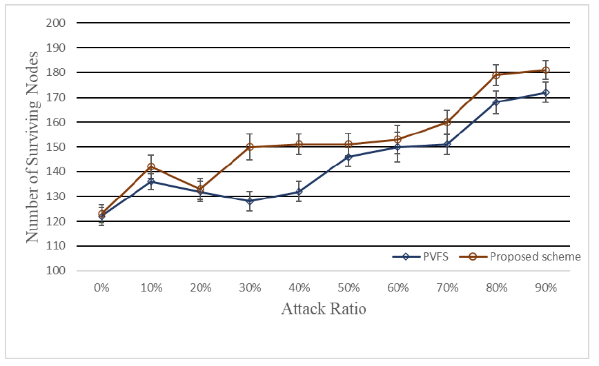 Fig. 12 shows the number of surviving nodes in field situations with various attack rates. In a WSN with the reflected security protocols, most false reports are detected and dropped in a few hops. Therefore, as the attack rate increases, the energy consumed by the entire network decreases. The graph also shows that under the proposed scheme, the number of surviving nodes increases. In a protocol such as the PVFS where CH re-selection does not occur, it is impossible to detect events in the energy-depleted regions of the CH. The proposed technique can alleviate the problem of such shadow areas. Overall, we confirmed an improvement of the node survival rate, and the shadow area problem was improved by about 9.55%.